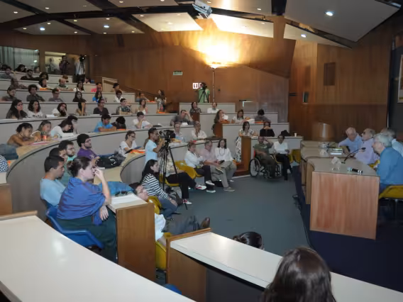 O Reitor Padre Mac Dowell S.J. diante dos docentes reunidos em assembleia sobre a demissão de professores.