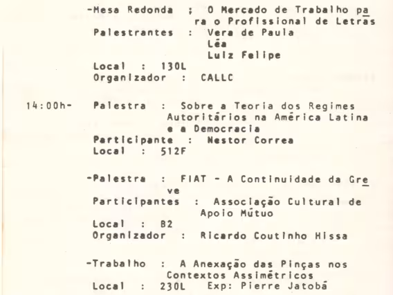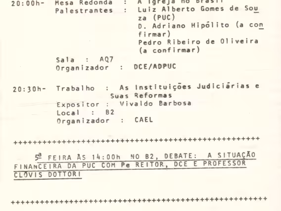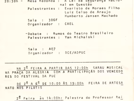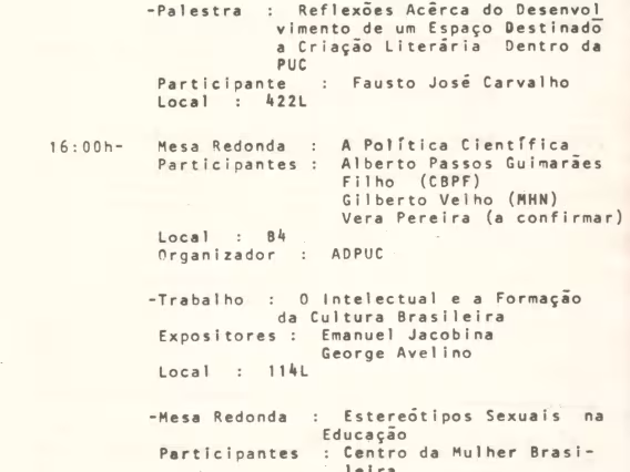 Programação do IV Congresso Interno da PUC-Rio. Página 13. Continuação das atividades do quarto dia do Congresso, 08/10/1981, incluindo palestras e exposição de trabalhos. DCE, ADPUC.