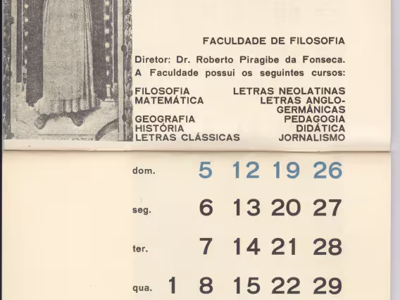 Calendário referente mês de Dezembro de 1961. Contém informações sobre a Faculdade de Filosofia, Ciências e Letras Santa Úrsula e a Escola de Biblioteconomia. Edição comemorativa do aniversário de 20 anos da Universidade. Imagem de alunos em uma biblioteca, talvez na Santa Úrsula.
