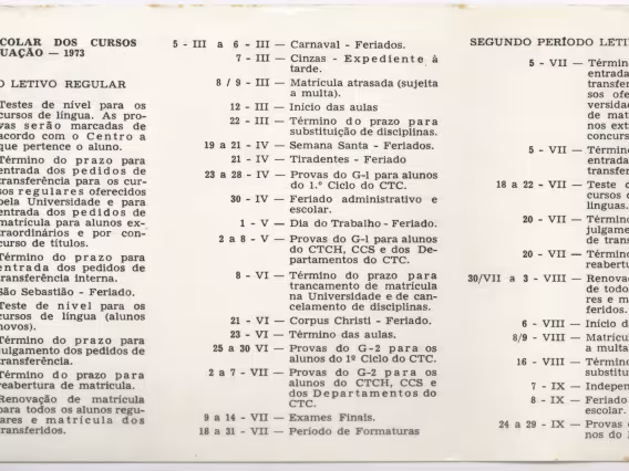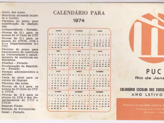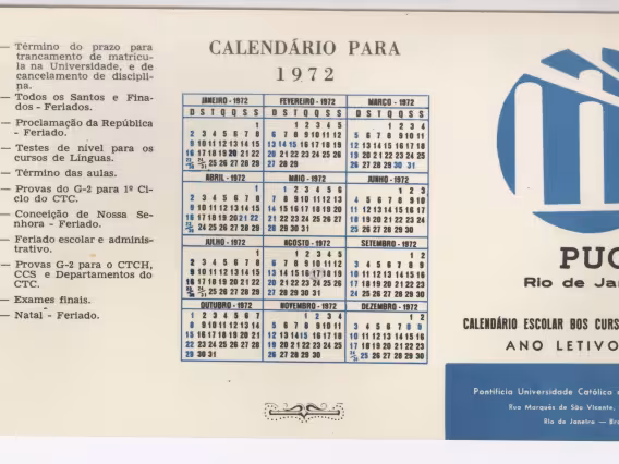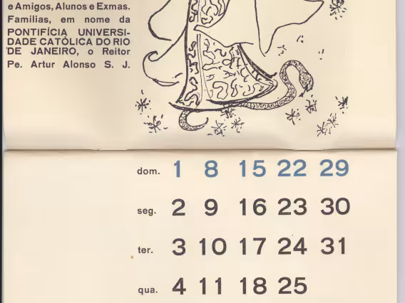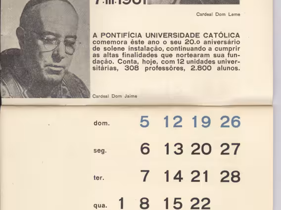 Calendário referente mês de Fevereiro de 1961. Contém informações sobre a Universidade e fotografias do Cardeal Dom Sebastião Leme e do Cardeal Dom Jaime de Barros Câmara. Edição comemorativa do aniversário de 20 anos da Universidade.