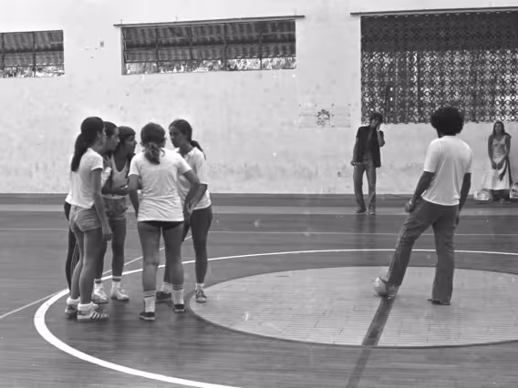 Alunas jogam futebol de salão. Conversam sobre a tática do jogo. Aluno filma em Super 8.