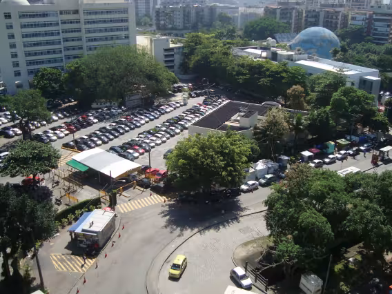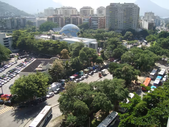 Imagem a partir do alto. Vê-se o Instituto Gênesis, o Planetário da Gávea e o terminal de ônibus urbanos.