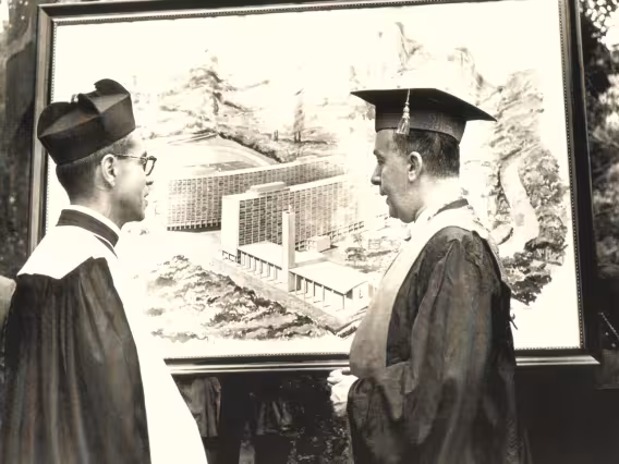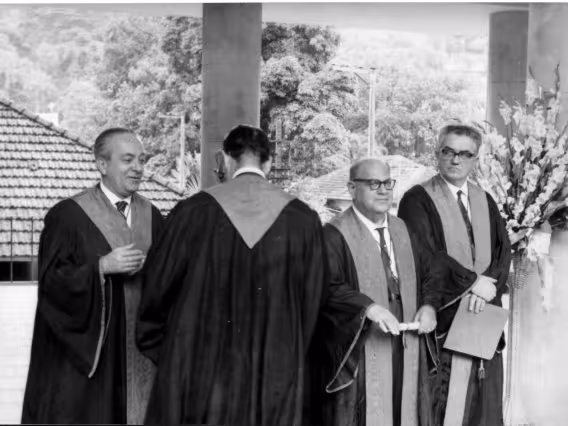 Convidados reunidos na comemoração do Jubileu de Prata da PUC-Rio. Na ocasião, com a presença do Embaixador da Alemanha Ocidental, foi inaugurado o prédio da Biblioteca Central e as novas instalações da Reitoria, ainda em obras, e houve a entrega das medalhas Cardeal Leme aos professores e o descerramento das placas aos benfeitores.