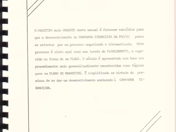 Página de abertura de um documento ("Plano de Marketing") que forneceria subsídios para desenvolvimento de campanha financeira da PUC-Rio.