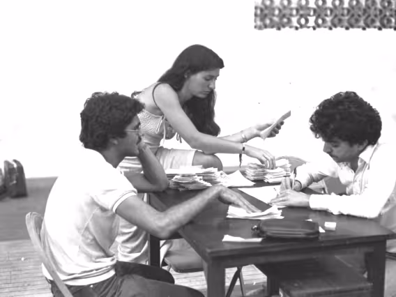 Funcionários e professores no arraiá realizado na Vila dos Diretórios.
