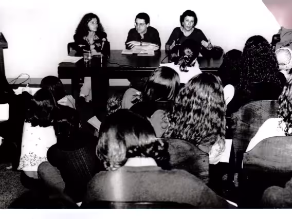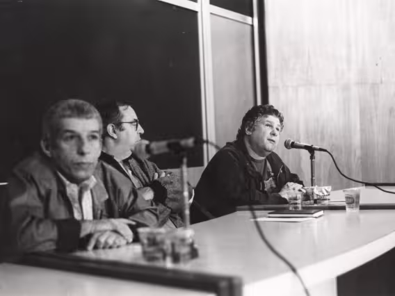 Palestra com o prof. Sílvio Tendler. Ao seu lado o prof. Miguel Pereira e o escritor Sérgio Sant'Anna.