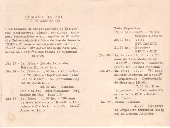 Folheto de divulgação da Semana da PUC, na qual houve o lançamento da Campanha Financeira e eventos artísticos. Programação de 23 de maio a 01 de junho. O tema eram os 50 anos da "Arte Moderna no Brasil" e "PUC - 21 anos a serviço da cultura". Conferências com o Pe. Ávila S.J., Alceu Amoroso Lima, Aníbal Machado e Henrique Mindlin. "Noite esportiva" com judô, voley e basquete. Concerto da Orquestra Sinfônica Nacional da Concha Acústica.
