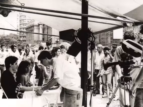 Fotografia do cineasta Cacá Diegues e de sua assistente de produção Fernanda Santos Neves publicada no Jornal da PUC. À época Fernanda cursava a graduação em Comunicação Social na PUC- Rio e trabalhava na produção de Orfeu, 14° filme de Cacá Diegues.