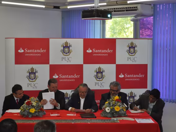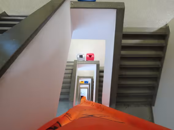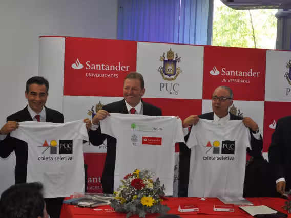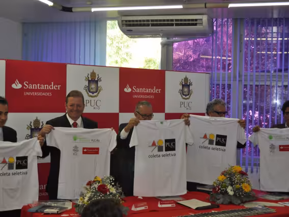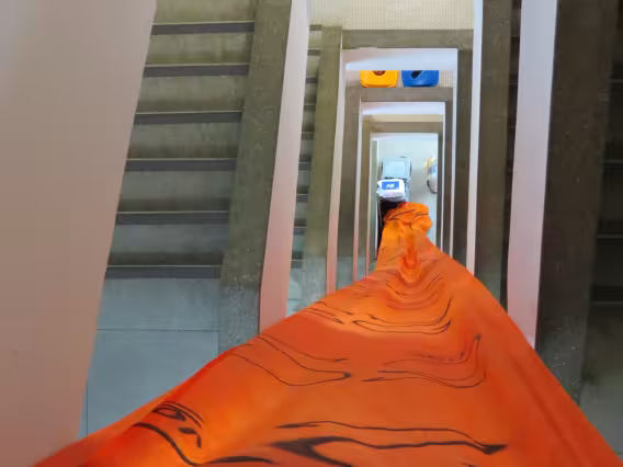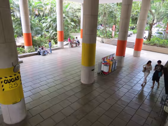 Intervenção com faixas laranjas e amarelas nos pilotis, como propaganda de chapas que disputaram as eleições de 2011 para o Diretório Central dos Estudantes da PUC-Rio (DCE).