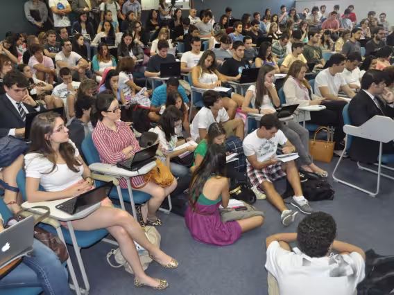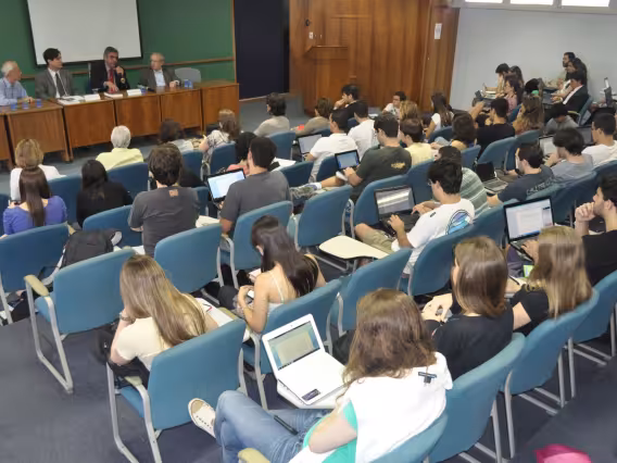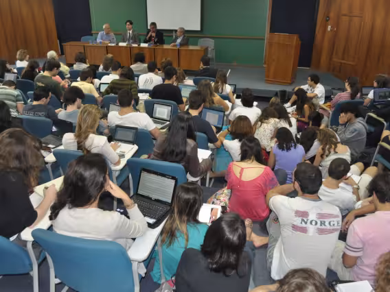 auditório lotado assite à aula magna oferecida por Paulo Markun ao Departamento de Direito da PUC-Rio. Sua palestra, 'A Rede de Legalidade', inaugurou o Ciclo de Debates sobre os 50 anos da Rede.