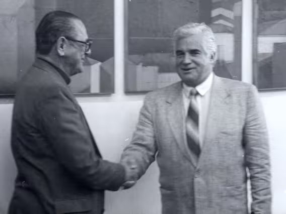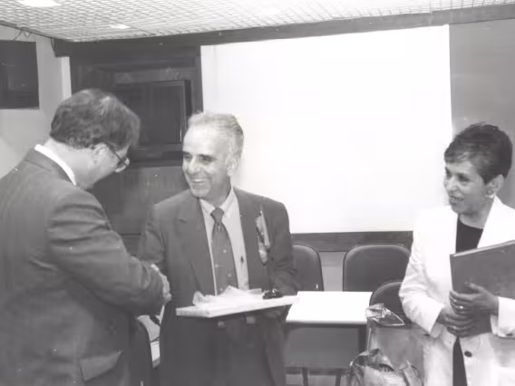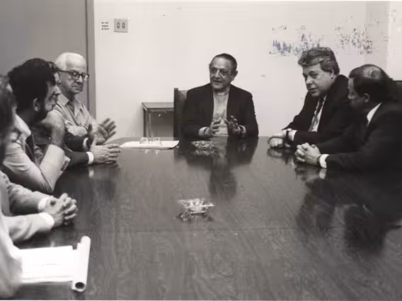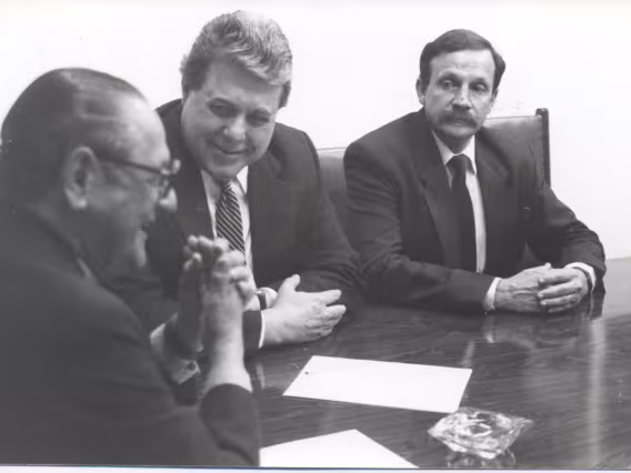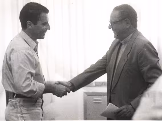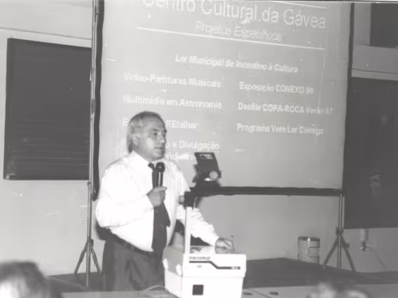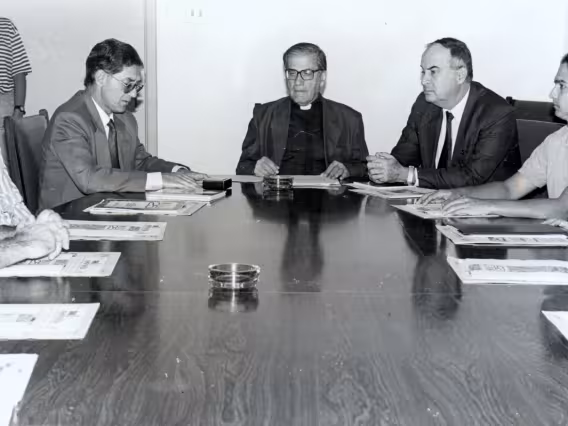 O Reitor Padre Laércio Dias de Moura S.J. e o Diretor de Marketing da IBM, Júlio Alvarenga, à direita, assinam um convênio para a criação do curso de extensão Gestão de artes e tecnologia multimídia. Segundo matéria do Jornal da PUC, o curso foi o primeiro a abordar a multimídia na América Latina.
