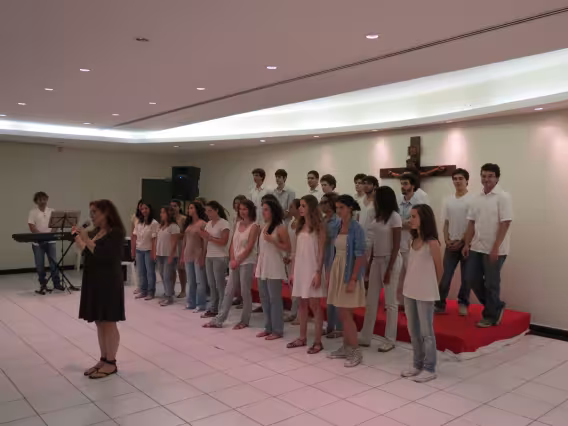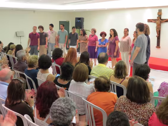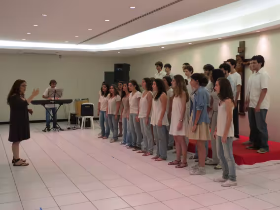 Apresentação do Coral da PUC-Rio no 29° Encontro de Corais na universidade, em novembro de 2011. Sob o comando do regente Geraldo Leão, os jovens abriram o evento com a interpretação do Hino Pontifício, de Charles Gounod, e ainda apresentaram um variado repertório, com composições nacionais e estrangeiras.