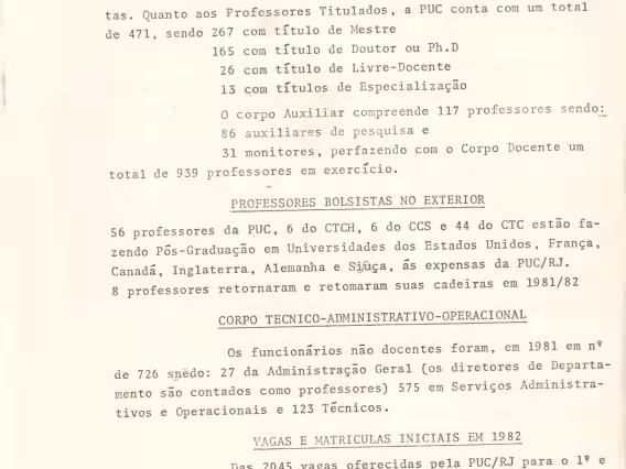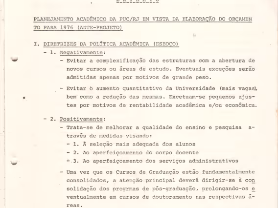 Estudo elaborado pelo pe. João Augusto Mac Dowell S.J. para o planejamento acadêmico da PUC-Rio de 1976. O documento avalia a política acadêmica da Universidade, apresenta critérios para a distribuição dos recursos orçamentários entre as áreas, indica propostas para consolidação dos programas de Pós-Graduação e para a implantação de novos departamentos, cursos de Mestrado, Doutorado e de Especialização. O estudo aponta também para a necessidade de construção de novas instalações - salas de aula e de professores -, da reestruturação da DAR, implementação de coordenação própria para os cursos noturnos, criação de um Centro de Recursos Audiovisuais, instalação de um museu no Solar Grandjean de Montigny e da automatização da Divisão de Bibliotecas e Documentação. Ao final, o documento indica propostas para elaboração de estudo sobre a distribuição racional das salas de aula, a revisão das tabelas salariais dos professores, e o estabelecimento de um período para férias coletivas - dezembro e janeiro - e para promoção do corpo docente e administrativo. O estudo foi enviado através do ofício OF.GT-21/75 pelo presidente do Grupo de Trabalho, prof. Antonio Ernesto Camargo Wanderley, ao prof. Paulo Novaes.