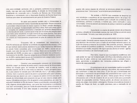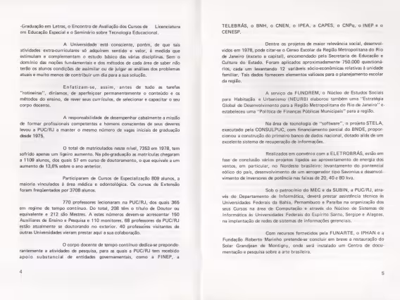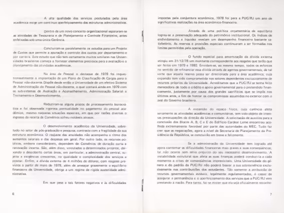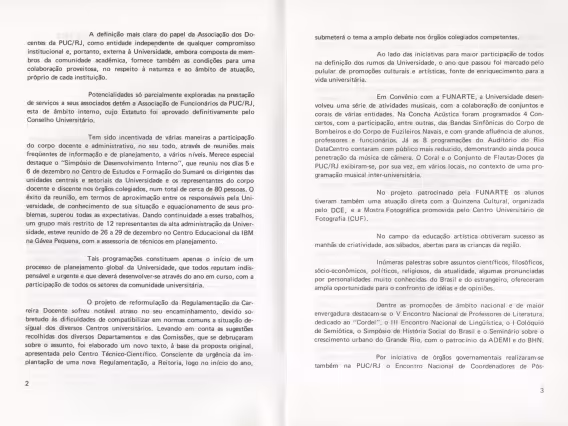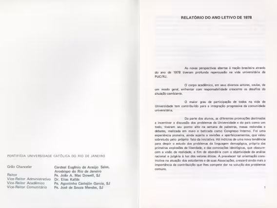O Relatório apresenta o balanço das atividades acadêmicas da PUC-Rio do ano de 1978. A publicação contém informações do corpo docente e discente, da Associação dos Docentes (ADPUC) e da Associação de Funcionários (AFPUC), do projeto de reformulação da Regulamentação da Carreira Docente e dos convênios estabelecidos com a FUNARTE, FINEP, BNDE, MEC, IPHAN, entre outros. Destaca os projetos, os eventos, as palestras e os seminários realizados em 1978 e traz também dados sobre a situação financeira da Universidade e das bolsas de estudos. O Relatório foi apresentado pelo reitor pe. João Mac Dowell S.J. na abertura do ano acadêmico em 09 de março de 1979.