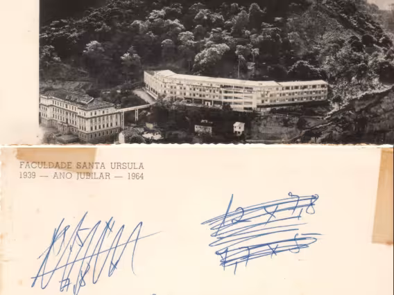 Frente e verso de postal da Faculdade Santa Úrsula: "1939 - Ano Jubilar - 1964 - (Morro do Mundo Novo, Faculdade e Lar Universitário) - Rua Farani, 75". Na foto, os prédios e as montanhas ao fundo, incluindo o Corcovado.