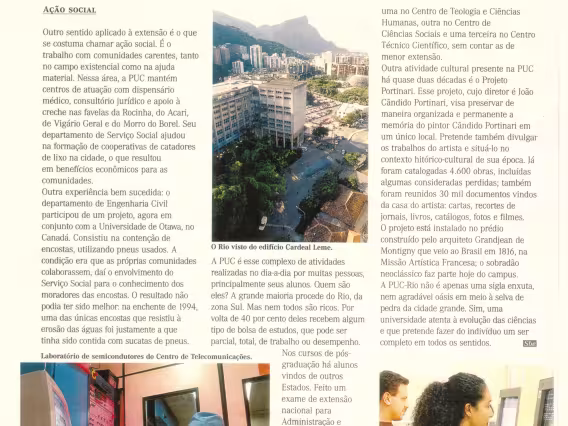 Foto do alto do edifício Cardeal Leme, a partir da varanda do Decanato do CTC. Vista do estacionamento externo, com automóveis e ônibus, o Laboratório de Desenvolvimento de Protótipos do Departamento de Artes. Vista de parte do bairro da Gávea.