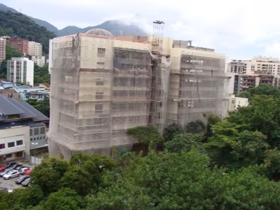 Fotografia aérea da Zona Sul do Rio de Janeiro. Em destaque, em primeiro plano, a serra da Carioca; à direita, na parte inferior, o Conjunto Habitacional Marquês de São Vicente e a PUC-Rio; e à esquerda, na parte superior, o Morro do Corcovado.