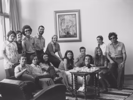Reunião durante entrega de prêmios na Semana da PUC de 1971. Provavelmente, da equipe ganhadora da gincana e membros da organização da Semana.