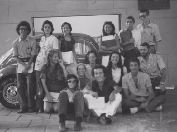 Participantes e premiados na Semana da PUC de 1971, em frente aos elevadores da Ala Kennedy, encostados em um Fusca, entregue como prêmio provavelmente da gincana.