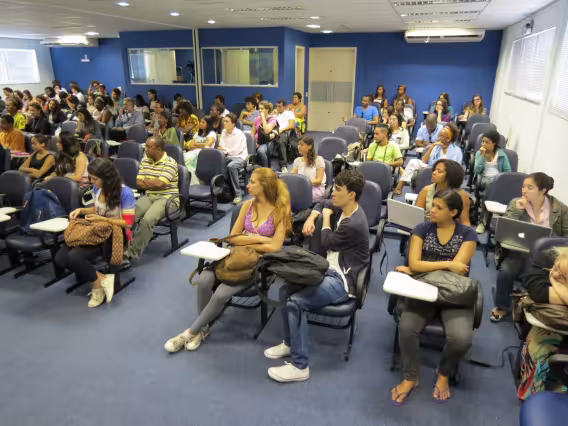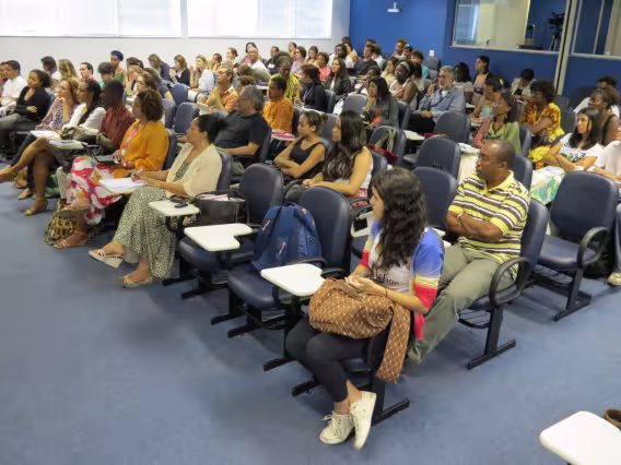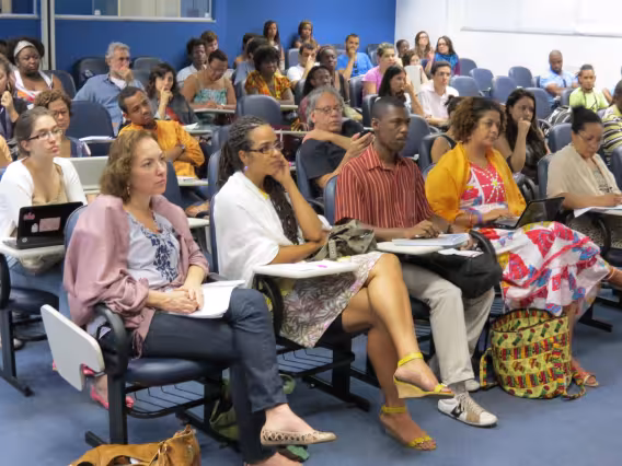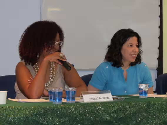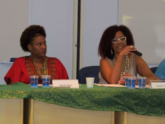 Seminário de Reflexão e Memória da Cultura Afrobrasileira', realizado na PUC-Rio em novembro de 2011. A imagem registra a mesa 'Gênero, Raça e Sexualidade', coordenada e mediada pela Professora Márcia Nina Bernardes, do Departamento de Direito da PUC-Rio, e formada pelos professores Sonia Giacomini, do Departamento de Sociologia e Política da universidade, Magali Almeida, da UERJ, e Joilson Santana, da SEASDH, e ainda pela representante da Aqualtune, Sheila Dias.