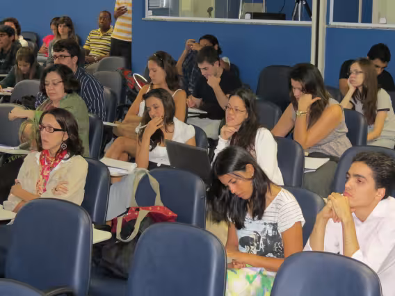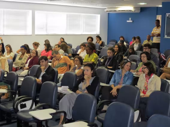 Seminário de Reflexão e Memória da Cultura Afrobrasileira', realizado na PUC-Rio em novembro de 2011. A imagem registra a mesa 'Gênero, Raça e Sexualidade', coordenada e mediada pela Professora Márcia Nina Bernardes, do Departamento de Direito da PUC-Rio, e formada pelos professores Sonia Giacomini, do Departamento de Sociologia e Política da universidade, Magali Almeida, da UERJ, e Joilson Santana, da SEASDH, e ainda pela representante da Aqualtune, Sheila Dias.