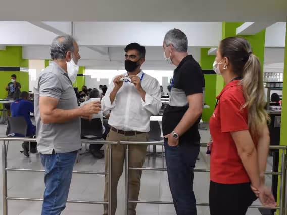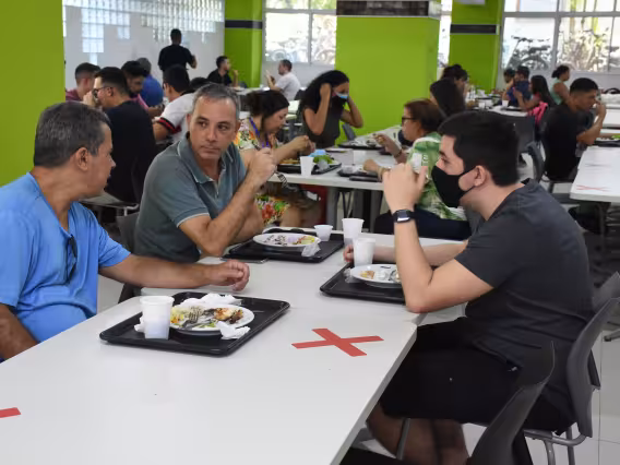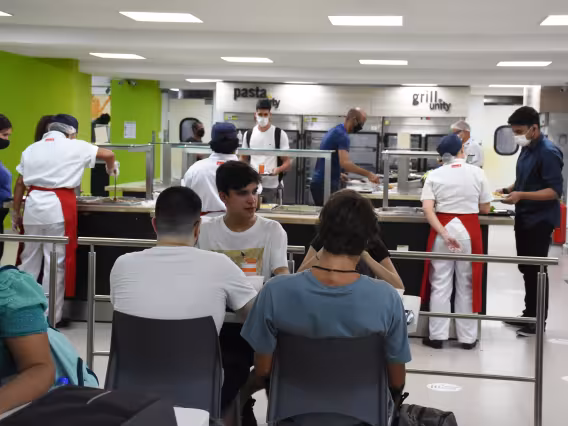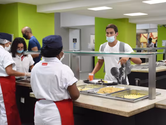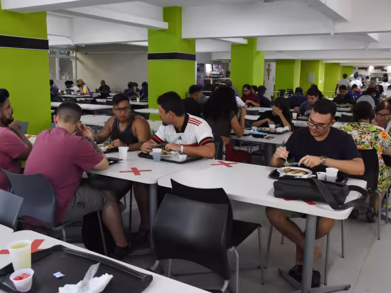 Ambiente do bandejão. Vê-se mesas e o local em que a comida era servida. Havia uma máquina de refrigerante.
