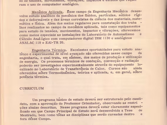 Seção referente à 'Engenharia Mecânica', incluindo o as disciplinas eletivas e suas ementas, no Catálogo oficial da Escola Graduada de Ciências e Engenharia (EGCE), 1968 - 1969.