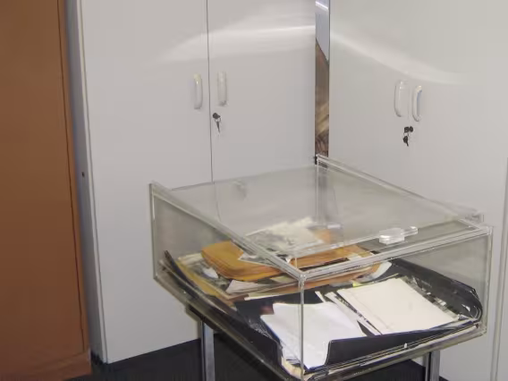 Gavetas contendo documentos do Solar, fitas VHS, fitas-cassete e outras pastas de documentos.