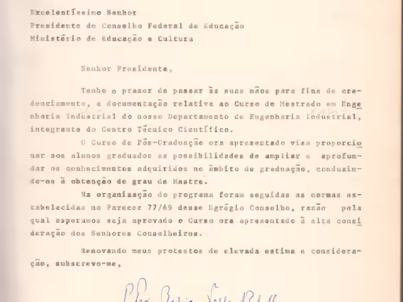 Correspondência do pe. reitor da PUC-Rio, pe. Velloso, S.J., para o presidente do Conselho Nacional de Educação (MEC), apresentando a documentação relativa ao curso de mestrado do Departamento de Engenharia Industrial.