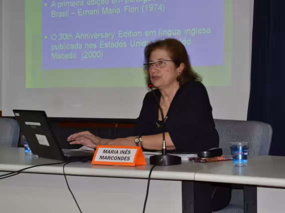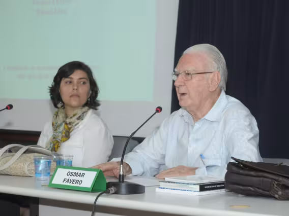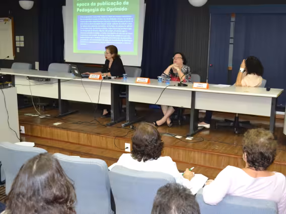 Os professores Elisa Siqueira e Osmar Fávero participam da mesa sobre as fichas de cultura do sistema de alfabetização Paulo Freire.