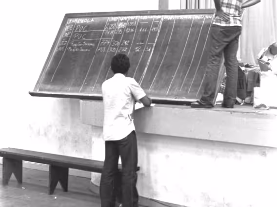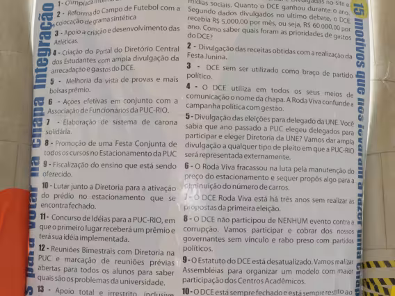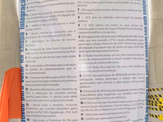 Painel fixado nos pilotis da ala Kennedy com propagandas das chapas que concorreram às eleições de 2011 para o Diretório Central dos Estudantes da PUC-Rio (DCE). Chapas Roda Viva, Integração, e outras.