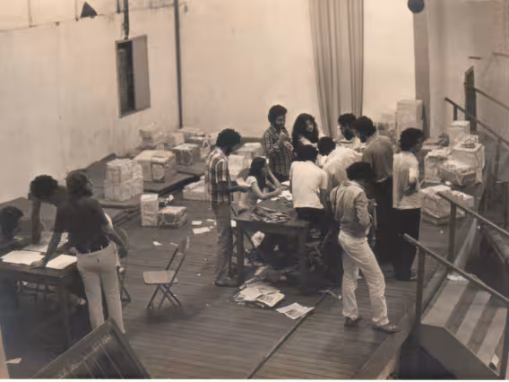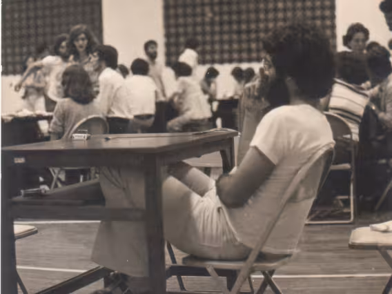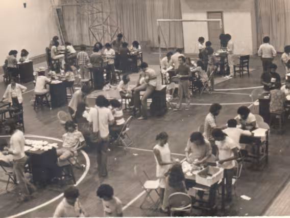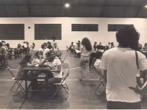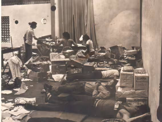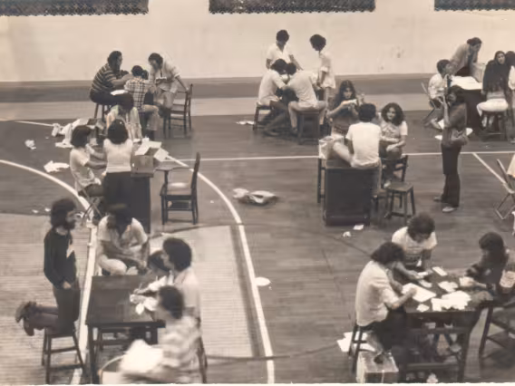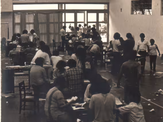 Representantes das chapas descansam no palco do ginásio sobre colchonetes de ginástica, pelo cansaço da virada de noite, em meio às caixas e pacotes de votos.