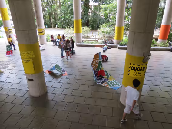 Intervenção com faixas laranja e amarela, e balões amarelos, nas escadas e pilotis do edifício da Amizade, com propaganda de chapas que disputaram as eleições de 2011 para o Diretório Central dos Estudantes da PUC-Rio (DCE).