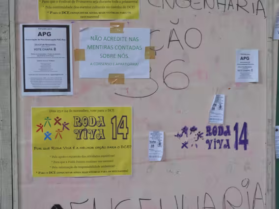 Painel fixado nos pilotis da ala Kennedy com propagandas das chapas que concorrem às eleições de 2011 para o Diretório Central dos Estudantes da PUC-Rio (DCE). Chapas Roda Viva, Consenso, e outras.