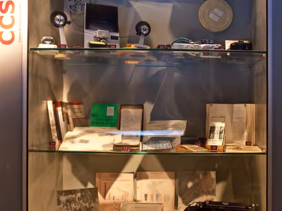 Estante com documentos, equipamentos, álbuns de fotografias e objetos dos departamentos do Centro de Ciências Sociais da sala Ícones da exposição PUC-Rio 70 Anos, Rumo aos 80.