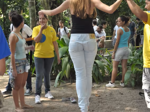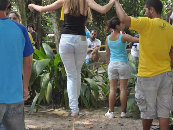 Visitantes no evento PUC por um Dia, próximos ao Anfiteatro Junito Brandão. Atividade de slackline.