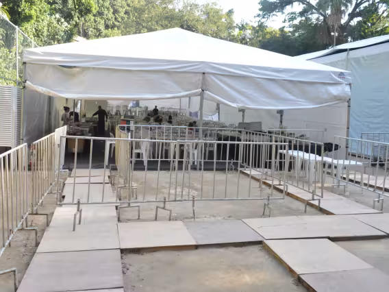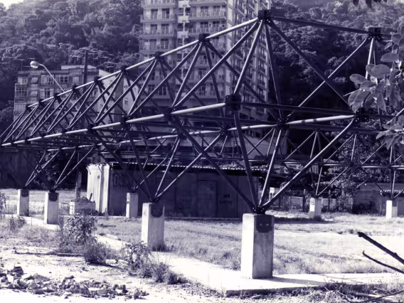 Estrutura metálica em construção no estacionamento da PUC. O projeto era o Laboratório da Oficina de Treinamento e Desenvolvimento de Protótipos (LOTDP), desenvolvido em convênio da PUC-Rio com a Finep.