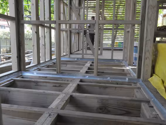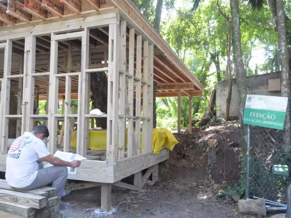 Montagem da casa sustentável entre as árvores.