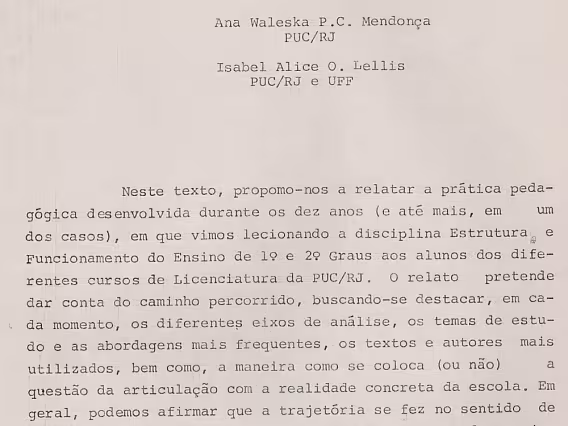 Início do artigo “Da estrutura do ensino à educação brasileira: reflexões sobre uma prática” de autoria das professoras Ana Waleska Mendonça e Isabel Alice Lellis, apresentado no seminário dos 20 anos do mestrado em Educação da PUC-Rio. Texto integral disponível no site do Núcleo de Memória.