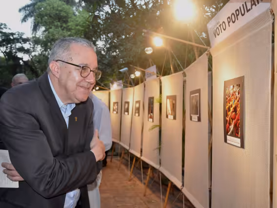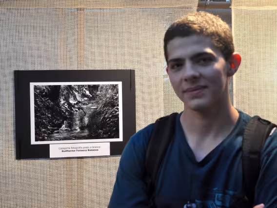 O reitor pe. Josafá Carlos de Siqueira, S.J. entrega prêmio a um dos vencedores do Iº Concurso de Fotografia da PUC-Rio, na abertura da Exposição PUC-Rio 70 anos, Rumo aos 80.