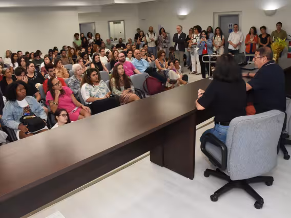 Mesa com palestrantes e ao fundo plateia presente no evento.