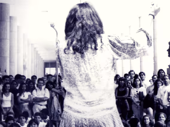 Alunos assistem a uma apresentação na 1° Feira de Humor da PUC-Rio, organizada pelos próprios estudantes da Universidade.