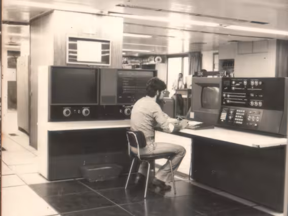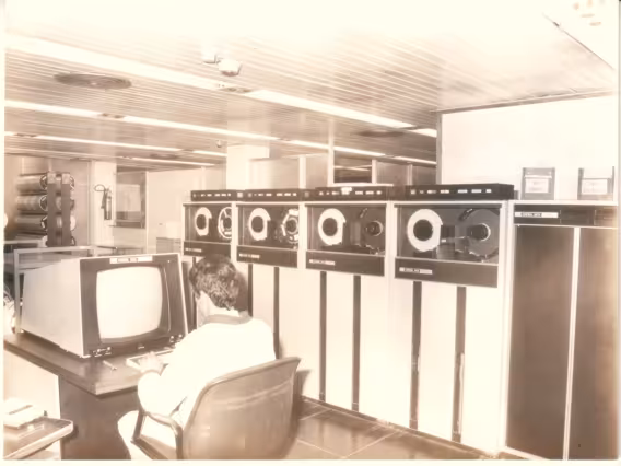 À esquerda, recipientes dos discos rígidos; à direita, leitores de fitas magnéticas, necessários para o funcionamento dos computadores de grande porte do RDC.