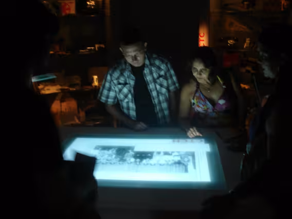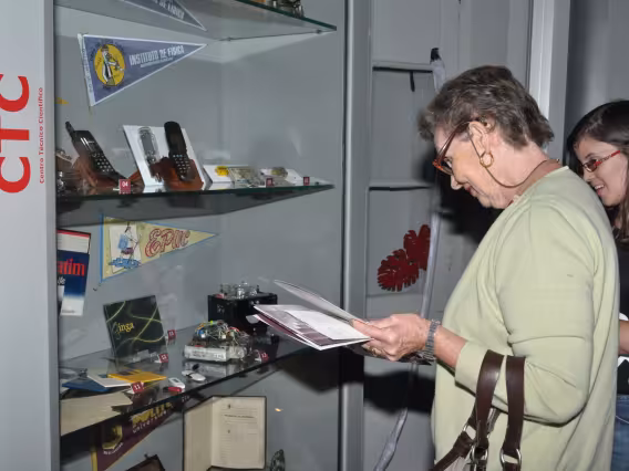 A monitora Juliana Cordeiro de Farias acompanha a avó durante a visita à exposição.