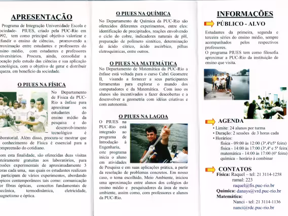 Apresentação do Programa de Integração Universidade, Escola e Sociedade - PIUES. O PIUES na Física, na Química, na Matemática, na Lagoa (Rodrigo de Freitas). Público-alvo. Contatos. Fotos de alunos em atividades.