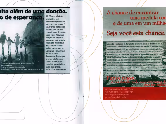 Folder sobre o Núcleo de Criação do Projeto Comunicar. Campanhas produzidas ao longo dos anos. Relação dos ex-estagiários de 1994 a 2004.