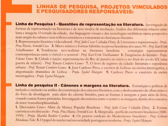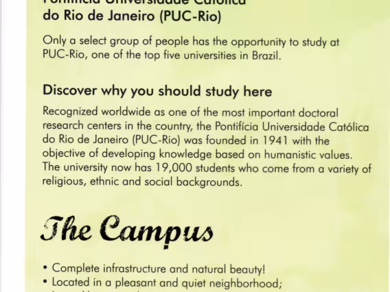 Folheto em inglês "Living in Rio - Study in English - Learn Portuguese". "The university", "The campus".