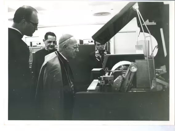 Visita ao CPD da PUC-RIo no mesmo dia da homenagem ao Jubileu do Cardeal Dom Jaime de Barros Câmara. Dom Jaime observa uma impressora.