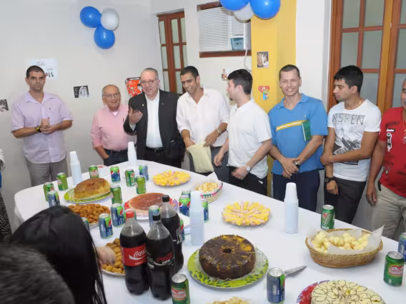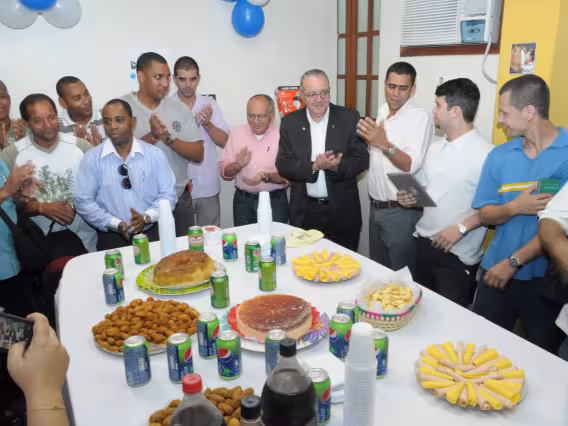 Funcionários em frente ao quadro de avisos com as fotografias dos pais com os seus filhos.