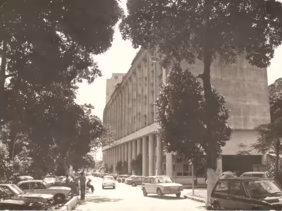 Fachada do prédio do Rio Datacentro, em frente carros estacionados e movimentação de estudantes e funcionários.